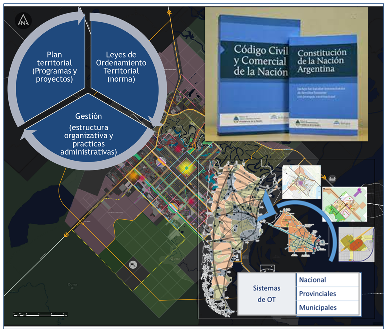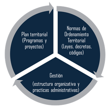 Sobre esa base se asume la necesaria articulación de marcos normativos que rigen para la gestión del territorio en general, y para cada uno de sus componentes en particular. Este trabajo asume una perspectiva que entiende a la política de ordenamiento territorial como un sistema dinámico constituido por tres elementos estructurales que se interrelacionan e interdefinen: el marco normativo que garantice su consolidación como política de Estado que trascienda las coyunturas de los distintos gobiernos, los planes de ordenamiento territorial con sus instrumentos operativos (los programas y proyectos) y el modelo de gestión (estructura organizacional y prácticas administrativas que permitan su concreción en el territorio). Desde este enfoque, la inexistencia, debilidad o incongruencia de algunos de estos tres componentes, condiciona fuertemente el cumplimiento de los objetivos que deben perseguir las políticas públicas, vinculados a asegurar el equilibrio territorial garantizando un desarrollo socioeconómico equitativo, protegiendo y preservando el medioambiente, con el fin de mejorar la calidad de vida de su población y, por otro lado, limita el rol protagónico que requiere asumir el Estado en esta materia para intermediar entre las necesidades del capital y las necesidades humanas.