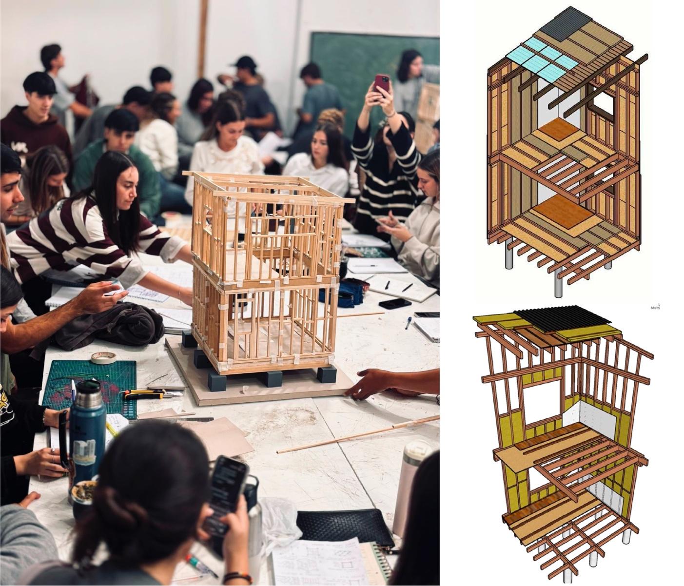 Imagen de portada. Fotografía en el Taller, de la actividad de maqueta 1:20 del sistema de entramado liviano de madera e imágenes 3D de la posterior aplicación del conocimiento en los trabajos grupales de los estudiantes. Fuente: Producción propia y Trabajo de estudiantes.