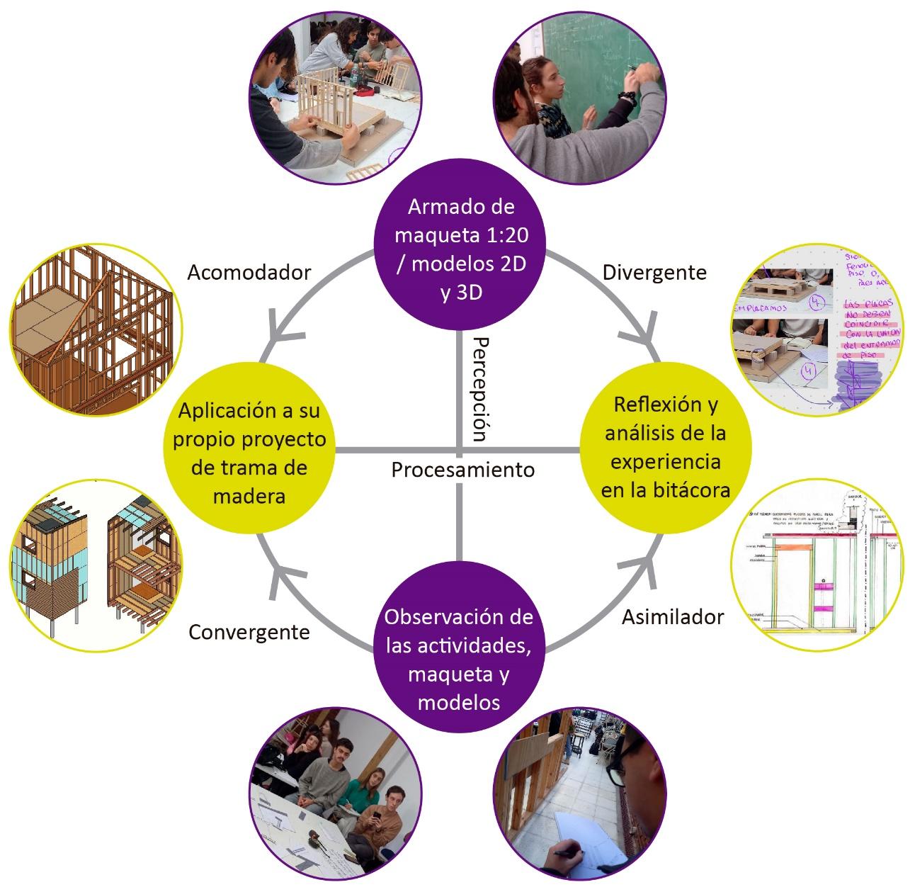 Esta metodología se ha aplicado en la enseñanza de la arquitectura, especialmente en el contexto de talleres proyectuales. Avci y Beyhan (2023) aplicaron la metodología de Kolb para diseñar una vivienda utilizando uno de los siguientes enfoques: accesibilidad, respuesta al clima o flexibilidad. En las clases combinaron la aproximación teórica y práctica, con el uso de maquetas análogas. Estas experiencias resultaron en una mejor asimilación del conocimiento por los estudiantes que con la aproximación meramente teórica. Reyes et al. (2024) realizaron encuestas a los estudiantes de la Benemérita Universidad Autónoma de Puebla, México, sobre los estilos de aprendizaje y concluyeron que, entre los estudiantes en la carrera de arquitectura están presentes casi por igual los cuatro estilos de aprendizaje de Kolb.