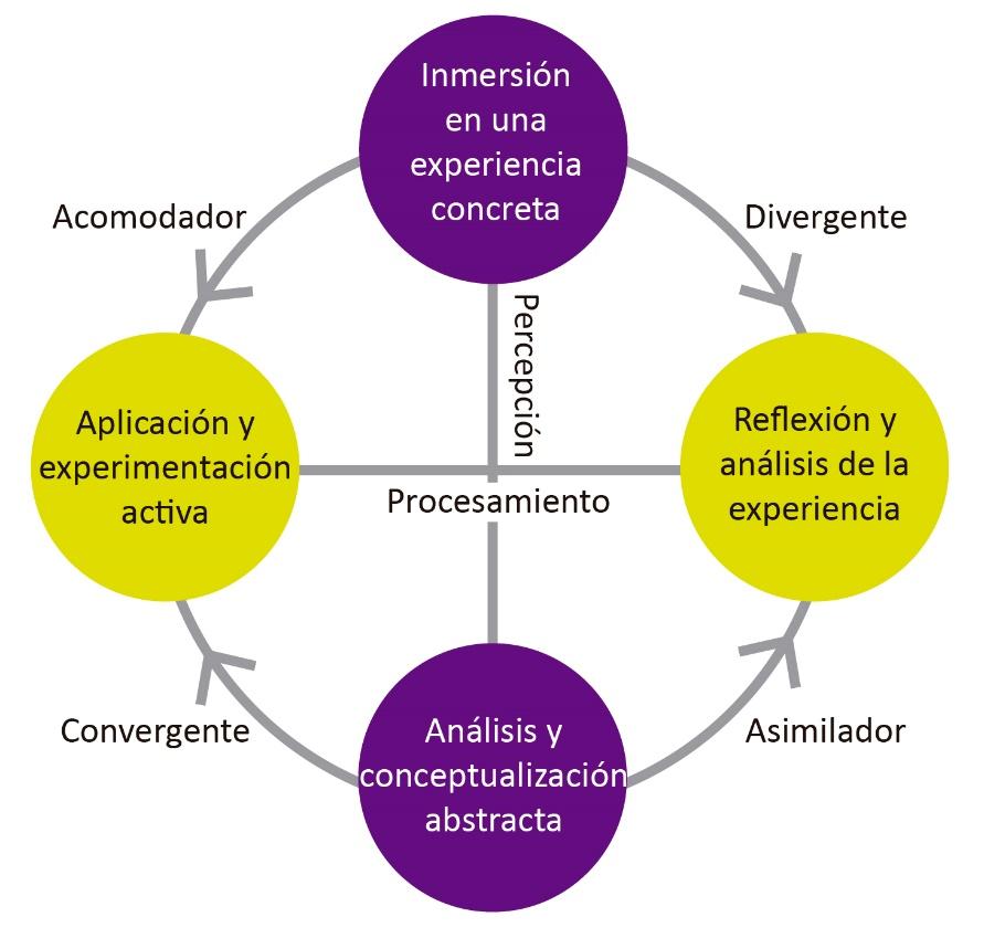 La metodología desarrollada se basa en la teoría de “aprendizaje experiencial” de Kolb (1984). Esta teoría se centra sobre la experiencia como generador principal del conocimiento, y el autor explica que, para eso combina el pragmatismo de Dewey, la investigación-acción de Lewin y el aprendizaje significativo de Piaget. Se eligió la metodología de Kolb por centrarse en el estudiante, en las estrategias de aprendizaje, y ofrecer aprendizaje situado. La teoría de Kolb reconoce dos tipos de opuestos de percibir la información: Experiencia Concreta y Conceptualización Abstracta, y dos modos opuestos de transformar la información: Observación Reflexiva y Experimentación Activa. Esto significa que algunos estudiantes perciben la información a través de experimentación práctica, mientras que otros, a través de conceptualización abstracta y análisis teórico, y a su vez, para transformar la información algunos prefieren hacer, mientras que otros, a observar y reflexionar. A partir de estos tipos de percibir y transformar la información, Kolb desarrolla los cuatro estilos de aprendizaje: el activo o acomodador, el reflexivo o divergente, el teórico o asimilador, y el pragmático o convergente (Figura 1).