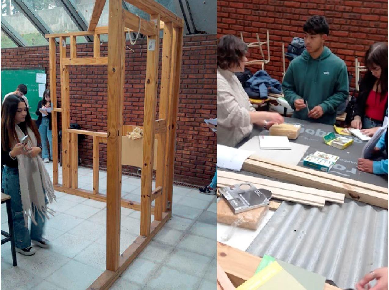 La duración de la actividad en la posta dos era de 60 minutos y se repitió para cada una de las 4 comisiones de 30 estudiantes aproximadamente. La actividad se desarrolló, por un lado, en torno a un modelo 3D construido en escala 1:1 de una esquina de obra armada con dos bastidores de madera de secciones 2” x 4” de pino ellioti. Por otro lado, en un área de cuatro tableros se ubicaron materiales y piezas de construcción reales para poder simular revestimientos en vertical y en la cubierta también en escala 1:1 (Figura 4). En esta posta había un docente a cargo, cuyo rol era de guiar las actividades e incentivar la curiosidad y el trabajo con preguntas.