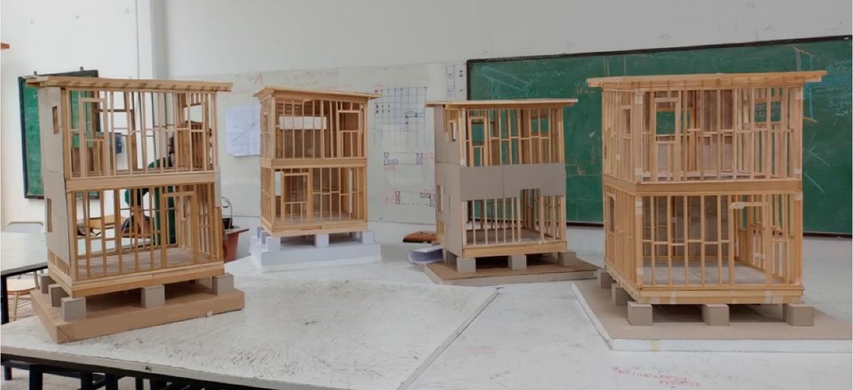 En esta actividad los estudiantes elaboran una maqueta de una vivienda en dos plantas en el sistema trama de madera. La actividad se desarrolla en dos etapas, una de trabajo fuera del aula y la otra en el taller. Para la primera etapa, los docentes han desarrollado el diseño de la vivienda con las planillas de bastidores para poder fabricar cada parte de la vivienda por el equipo de estudiantes. Al tener los planos, cortes y vistas de la vivienda, por un lado, y por otro, las planillas de bastidores, cada grupo de dos estudiantes debía preparar previamente de la clase una parte de la maqueta. Dentro de las tareas está la fabricación de los cimientos, bastidores de muros, bastidores de estructuras horizontales (piso, entrepiso y cubierta) y placas de cartón que simulaban las placas de rigidización. Esta instancia simulaba lo que podríamos llamar “trabajo en taller de prefabricación de piezas”. El objetivo de esta parte de la actividad es reforzar sobre la lectura, representación e interpretación de planos. Sin planos correctamente acotados y dimensionados y sin la correcta interpretación y fidelización en la fabricación, no sería exitoso el resultado posterior de montaje.