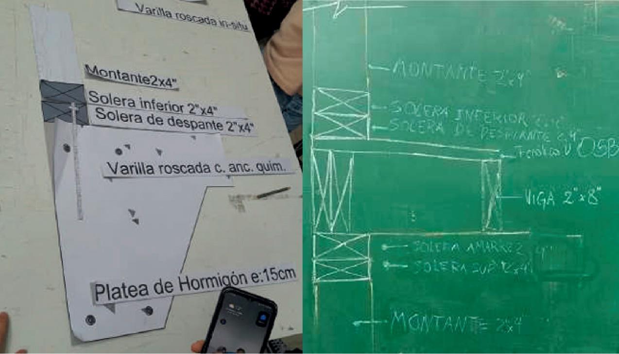 Las actividades de la posta 3 eran de duración de una hora y se repitieron cuatro veces en la mañana, una vez para cada comisión. La actividad se desarrolló en dos partes. Por un lado, sobre un tablero se montaron en 2D diferentes encuentros del sistema de entramado liviano de madera como: cimientos y muro, entrepiso y muro, cubierta y muro, y la resolución de los vanos en la fachada. Para esto, los docentes previamente fabricaron una serie de piezas impresas en escala 1:1 y reforzados sobre cartón, los cuales representaban los elementos estructurales del sistema trama de madera. Las piezas se presentaban mezcladas y sin referencia en el tablero, y los estudiantes tenían que analizar qué pieza se necesitaba para cada encuentro y buscarla. Simultáneamente se trabajaba en 2D a escala 1:1 en la pizarra (Figura 5).