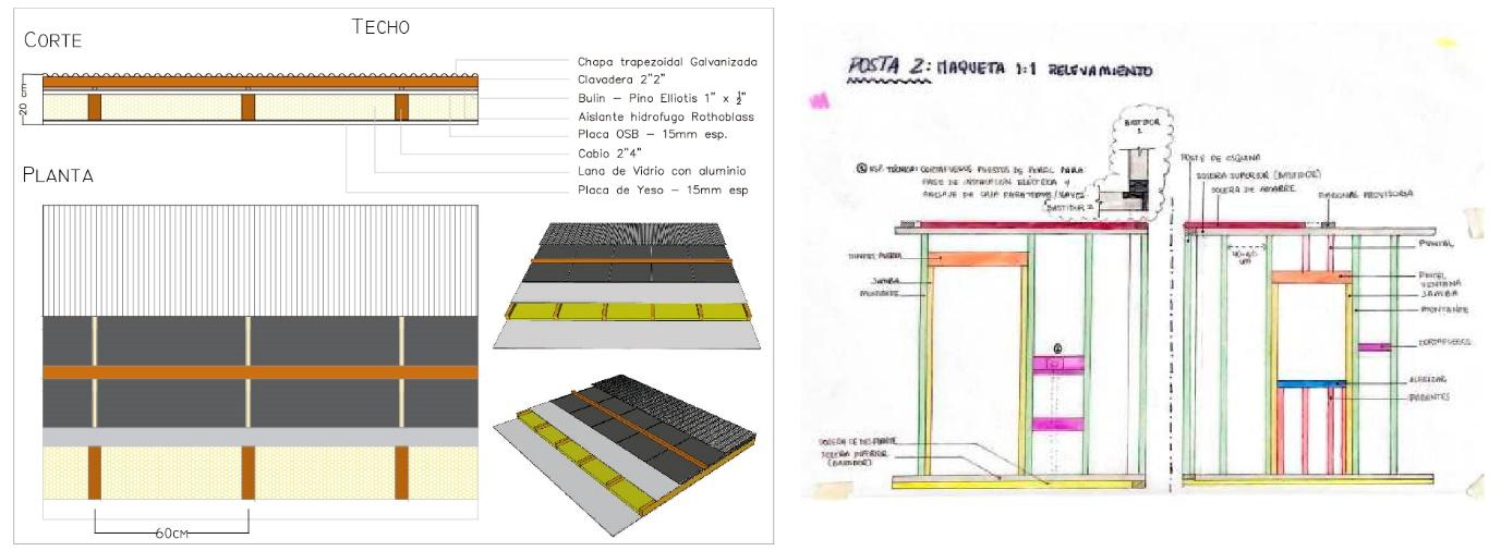 Los resultados directos, volcados en las bitácoras individuales y en los proyectos de los estudiantes muestran una abstracción, reelaboración de la información, y adaptación de la misma a su propio proyecto (Figura 8). Especialmente importante resulta remarcar la vinculación entre los materiales y las funciones que cumplen. Se observó que los estudiantes que no entendieron la función de cierto elemento o material, apenas aprenden superficialmente. Un caso de error recurrente aparece en el armado de la cubierta con el uso de bulines (listones) y clavaderas, mientras los estudiantes no entienden qué función cumple cada una, su uso es dispensable. Para lograr, lo que Piaget llamaba, aprendizaje significativo los estudiantes tienen que entender la función de cada capa y entonces su uso se vuelve indispensable. Mas importante todavía, una vez que se tiene en cuenta todas las solicitaciones a las que hay que dar respuesta y los materiales disponibles, la actividad tiende a que los estudiantes se puedan abstraer de un armado concreto y solucionar los mismos problemas en otros sistemas u otro tipo de armado de cerramientos.