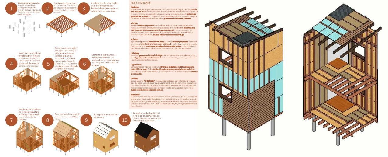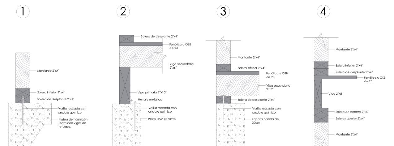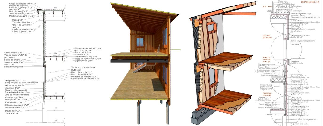 Se elaboraron los dibujos de los cimientos contemplando cuatro variantes: pilotes, bases aisladas, zapatas corridas y platea, cada una representada mediante su correspondiente detalle constructivo, con especial hincapié a la vinculación entre el sistema de madera y el cimiento. A continuación, se dibujó el entrepiso en sus dos cortes principales: longitudinal y transversal. Luego se detalló la carpintería (ventana). Finalmente, se desarrollaron los encuentros de cubierta, considerando dos alternativas: cabios y cerchas de madera, ambas representadas también en cortes longitudinal y transversal. A partir de estos detalles se conformaron las distintas variantes posibles, surgidas de la combinación de los elementos, encuentros y resoluciones constructivas.
