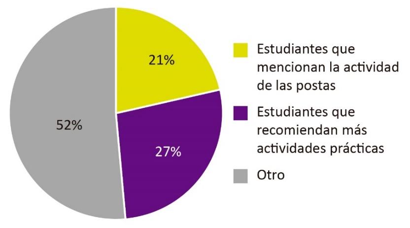Se analizaron los resultados de las tres últimas preguntas abiertas de la encuesta correspondiente al año 2024, las cuales estaban relacionadas con comentarios orientados a mejorar el curso mediante la incorporación o eliminación de actividades. En los resultados se observó que varias respuestas mencionaban la actividad de las postas. En la figura 11 se observa que, de los 70 estudiantes que respondieron a la encuesta, un 21 % mencionaba directamente la actividad de las postas, siempre con connotación positiva, pidiendo que se realicen más actividades similares a lo largo del año. Otro 27 % recomendó realizar más actividades prácticas o visitas a obras, sin mencionar específicamente esta actividad (algunos de estos votos podrían aludir a ella y otros no). El restante 52 % de los estudiantes solicitó otros aspectos no relacionados con las actividades prácticas. Algunos de los comentarios relacionados a la actividad de las postas fueron: