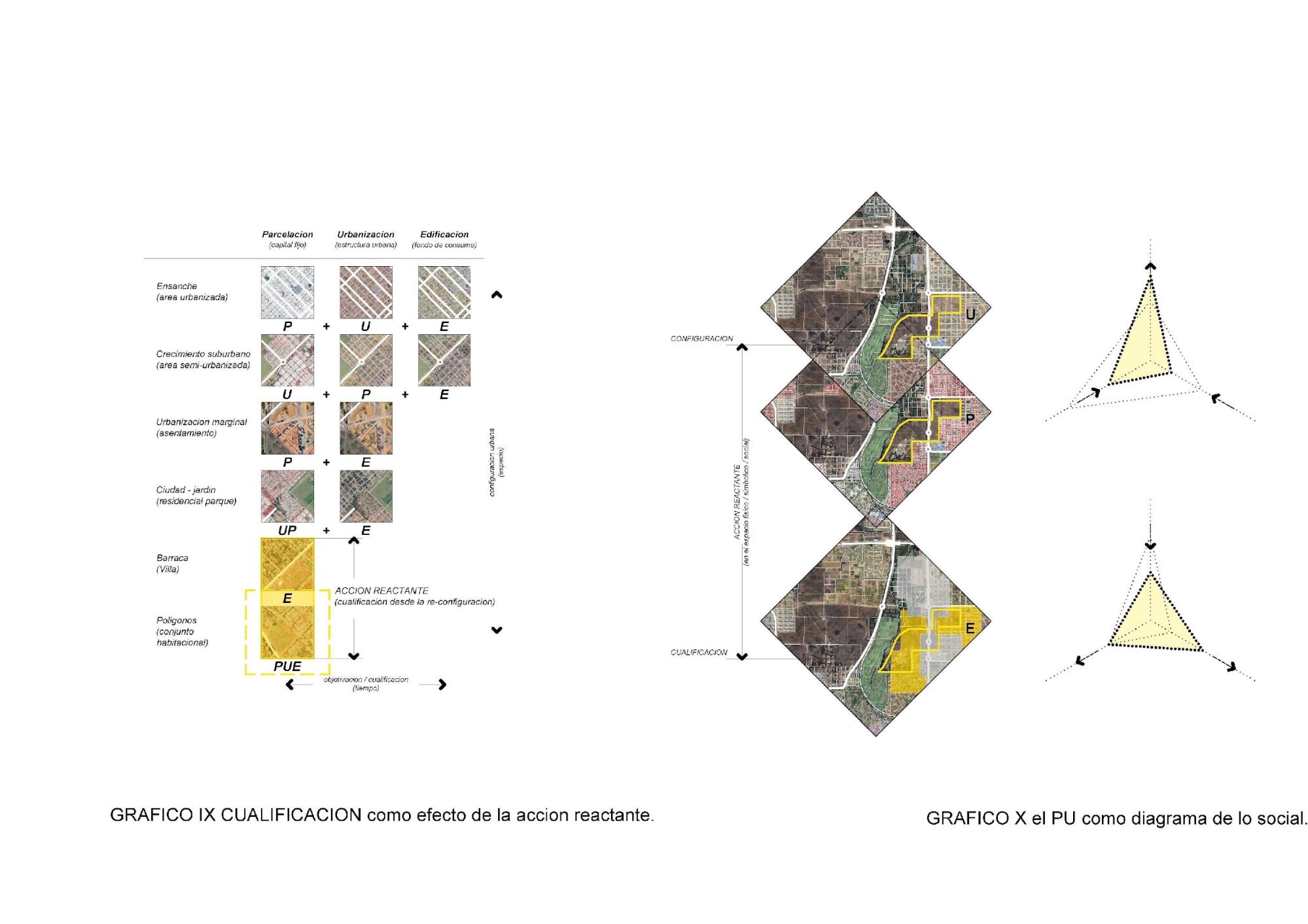 La modelización diagramática -que expone las relaciones entre variables que fundamentan la hipótesis- del concepto de configuración urbana como sistema complejo (Figura N°11) explica de modo sintético las correspondencias que se generan entre acciones y reacciones en un sistema complejo y sirve de base lógica para la deducción de acciones reactantes inclusivas de cualificación.