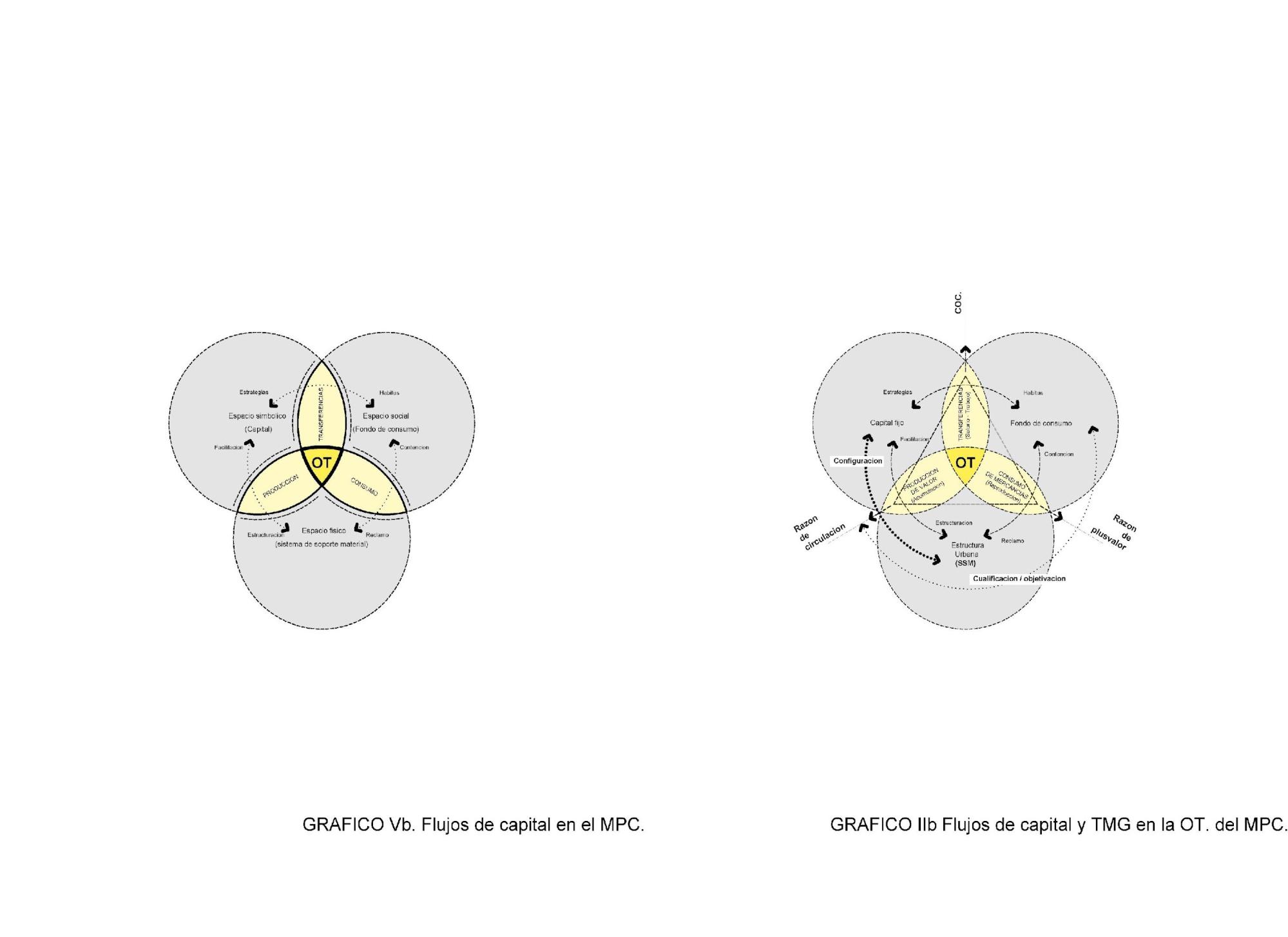 Esta manifestación espacial es desde donde construir un esquema topológico de las tensiones entre los tipos de espacio -medios o capitales- establecidos: el espacio simbólico -el capital-; el espacio social -el fondo de consumo- y el espacio físico -el sistema de soporte material- y sus relaciones dinámicas -como acciones basadas en las expectativas de ganancia y articuladas por las reglas sociales en el espacio-: de producción -entre capital y sistema de soporte, donde el capital define las reglas y el sistema de soporte facilita la acción de aquel-; de consumo -entre fondo de consumo y sistema de soporte, donde el sistema de soporte contiene y el fondo de consumo reclama-; y de transferencia -entre capital y fondo de consumo, donde el capital define las reglas y el fondo de consumo implementa estrategias de resistencia- (ver Figura N°5).