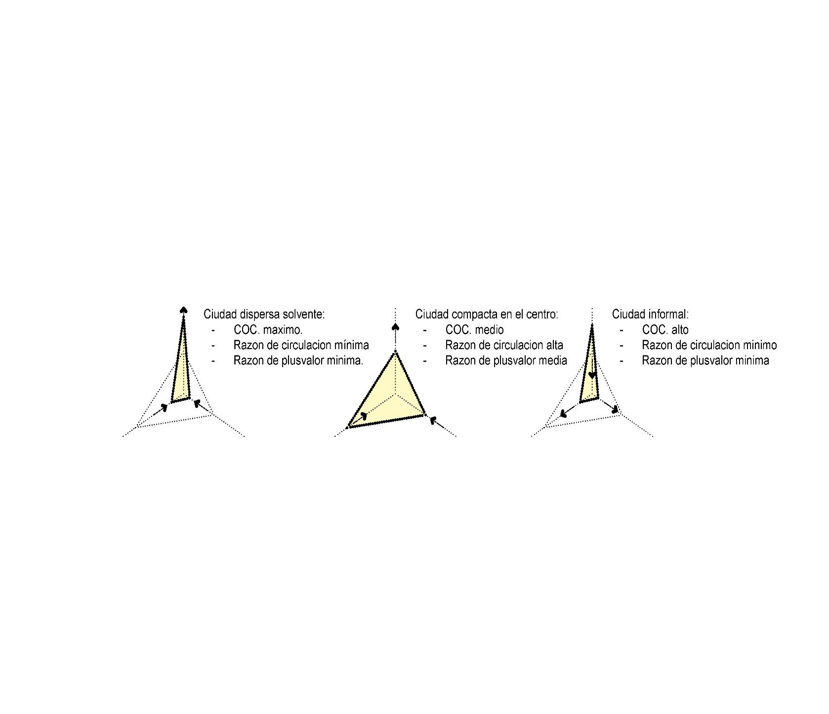 Regresando ahora a la idea de que a distintas configuraciones se corresponden a distintas relaciones de equilibrio entre captación y socialización de plusvalías -y sus efectos de integración social-, puede desarrollarse -provisionalmente a nivel cualitativo- una colección de diagramas radiales que grafiquen la relación entre categorías -COC, razón de circulación y razón de plusvalor- y modelos de configuración urbana.