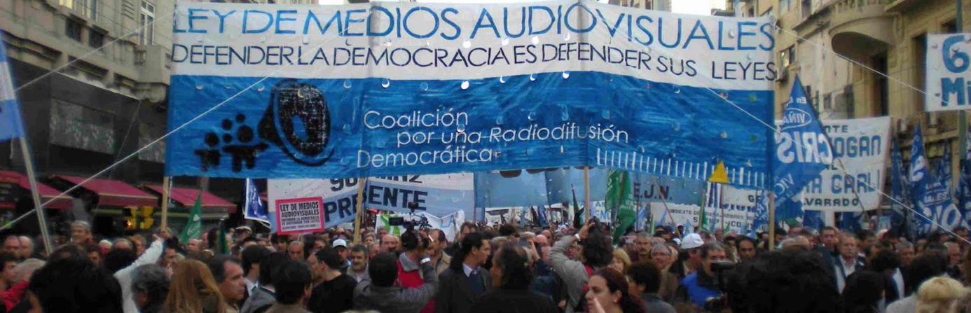 Imagen de portada. Una multitud marcha por una calle del centro de Buenos Aires portando banderas y carteles en apoyo a la Ley de Servicios de Comunicación Audiovisual. En el centro de la foto se destaca una gran bandera azul y blanca con la consigna “Ley de Medios Audiovisuales. Defender la democracia es defender sus leyes”. Fuente: ¿Qué pasó con la ley de medios?, por Marcelo Valente. Publicada 5 de marzo de 2021. Disponible en: https://esferacomunicacional.ar/que-paso-con-la-ley-de-medios/