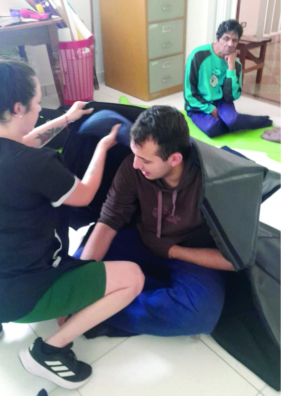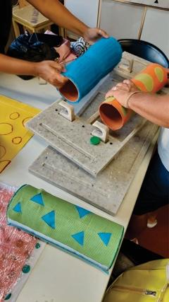 Se pudieron entregar a la asociación (figura 7) dos tableros modulares que incluían dos rodillos con siete elementos texturantes, y una mantadomo con cinco elementos modulares y doce almohadillas de diversos tamaños y peso.