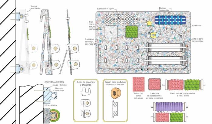 Los tableros (figura 6) se realizaron a partir de placas de plástico reciclado de la empresa Necrológica, de la ciudad de Necochea, mecanizadas con una máquina de CNC. Para la construcción de los rodillos se reutilizaron recortes de tubos de PVC, se realizaron piezas impresas por fabricación aditiva en PLA que vinculan los rodillos a las placas. Por último, para las texturas intercambiables, se utilizaron diferentes textiles y elementos que las componen. Luego de esto, se realizó el ensamble correspondiente entre piezas.