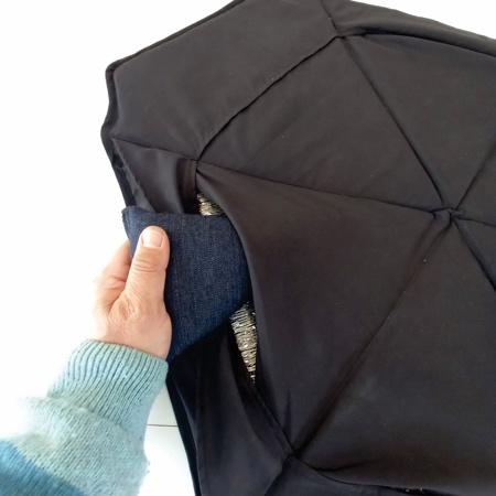 Se realizaron también almohadillas de tela con semillas, en forma de triángulo para favorecer la autorregulación que pueden colocarse en los bolsillos mencionados. Estas decisiones surgieron del intercambio con las terapistas, quienes aportaron observaciones sobre la ubicación del peso y el lado del textil más adecuado para ubicarlas. En cuanto al color se optó por textiles negros para evitar intervenciones si hubiera otro más llamativo durante el uso.