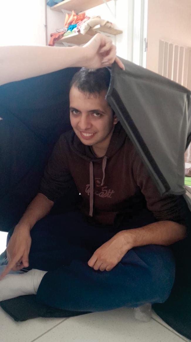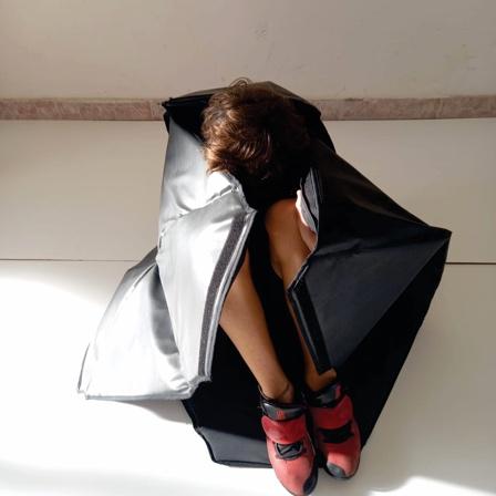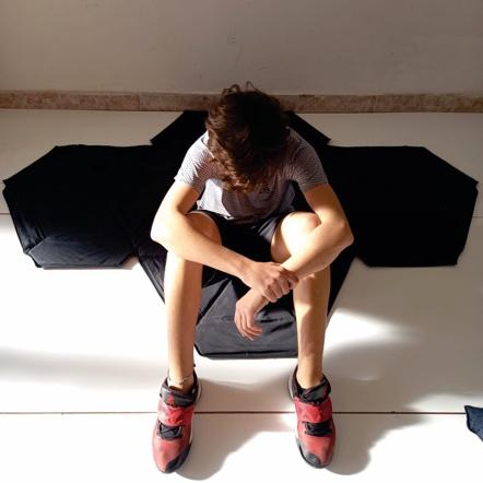 En cuanto a la materialidad, se estableció la utilización de diferentes textiles: la superficie en contacto con el cuerpo debía ser lisa, suave y blanda, además de cumplir con el requerimiento de no absorber líquidos ni mancharse fácilmente. Se descartó el uso de telas aptas para lavado frecuente, ya que no favorecen la estimulación táctil autorreguladora y encarecen la confección. El textil en contacto con el suelo, debía poseer alta resistencia al desgarro, así como también una superficie lisa para facilitar la limpieza. La unión de ambos textiles se resolvió mediante una cinta de tela que envuelve en los bordes y costuras diagonales que conforman seis triángulos. Entre las capas se incorporó una espuma de 1cm de espesor, removible gracias a los bolsillos formados por la tela superior, lo que facilita el lavado.