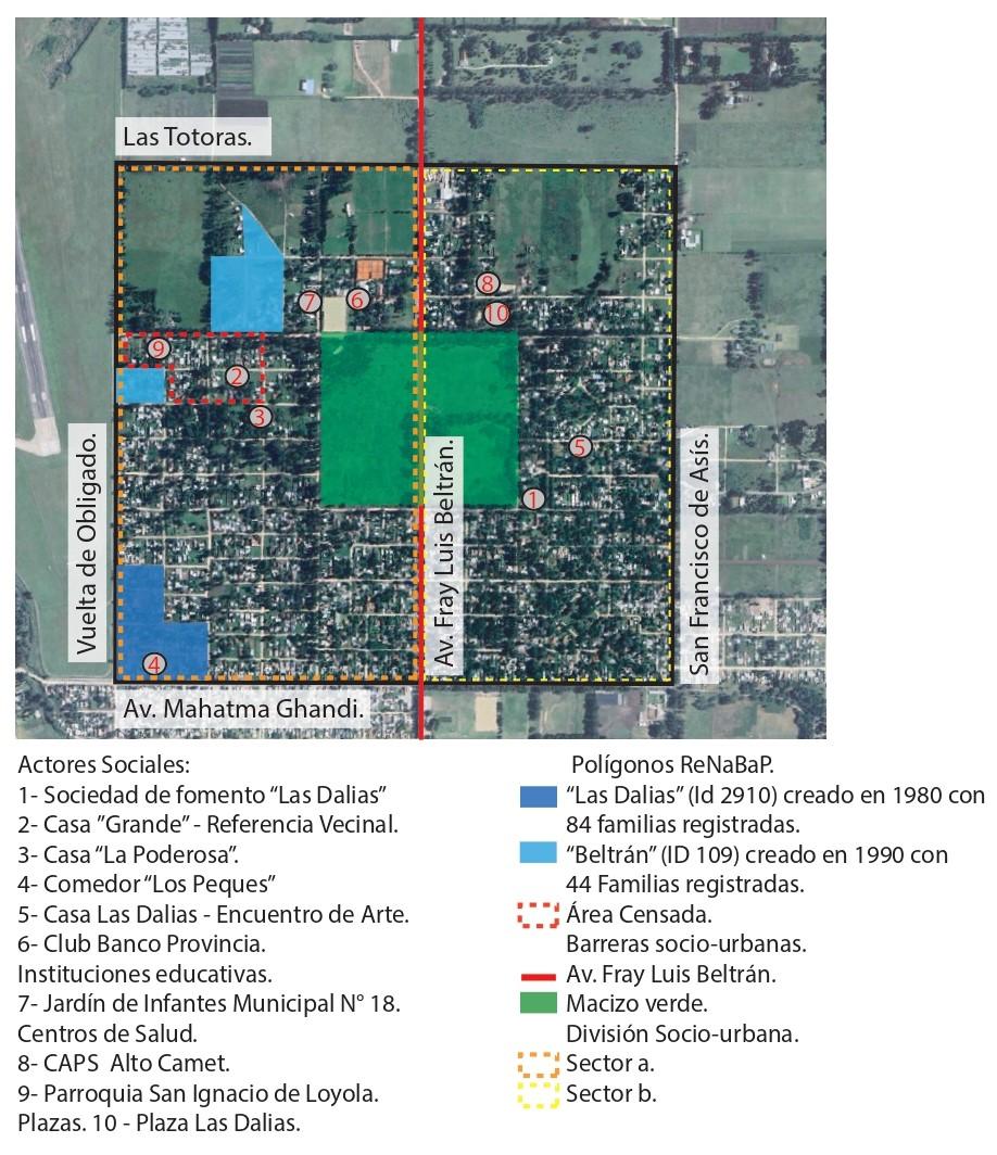 El proceso de adhesión al programa de Registro Nacional de Barrios Populares (ReNaBaP) genera también fragmentación en el barrio. Hasta el comienzo del 2024 solo 6 manzanas de la totalidad del barrio, se encontraban registradas. Estas a su vez están divididas en 2 polígonos. Uno con 5 manzanas denominado “Las Dalias” (ID 2910) creado en 1980 con 84 familias registradas. El otro polígono con la manzana restante se denomina “Beltrán” (ID 109) creado en 1990 con 17 familias, en este se da la particularidad que durante el 2024, se incorporaron 27 familias al registro virtual.