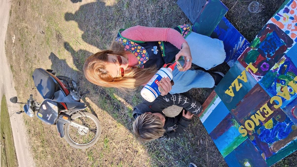 Figura N° 8 y 9. Niñxs pintando las partes que compondrán luego el primer cartel de la plaza durante el Festival de las Infancias en la plaza. Tallerista de arte junto a uno de los niños del barrio ensamblando el cartel de la plaza durante el Festival de las Infancias en la plaza. Agosto de 2025.