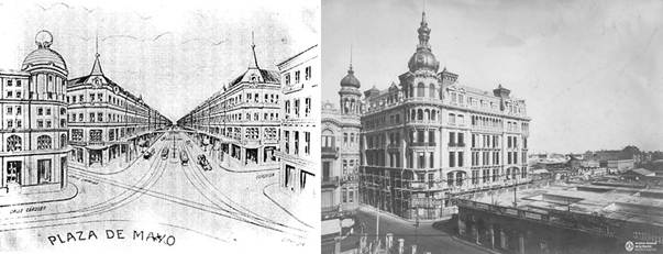 Figura 3. De izquierda a derecha: 3a. Perspectiva de la proyectada avenida central, 1910. Reproducido en Álvarez (1981, p.590); 3b. Edificio de La Inmobiliaria durante su construcción, calle Corrientes y Córdoba, Rosario, 1915. AR-AGN-AGAS01-rg- Caja 3056- Inventario 89248.