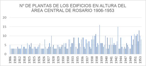 Gráfico 1. Número de plantas de los 137 edificios en altura construidos en el área central de Rosario hasta 1953, ubicados cronológicamente