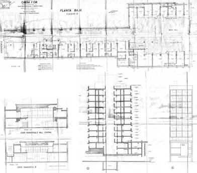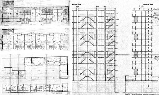 Figura 9. César (1952). Planta alta de los pisos 3º, 6º, 9º y 12º. Archivo Obras Particulares de la Municipalidad de Rosario. Carpeta 471; 9b. Edificio Galería César (1952). Planta alta de los pisos 4º, 5º, 7º, 8º, 10º, 11º y 13º. Archivo Obras Particulares de la Municipalidad de Rosario. Carpeta 471. 9c. Edificio Galería César (1952). Planta entrepiso sobre PB. Archivo Obras Particulares de la Municipalidad de Rosario. Carpeta 471; Derecha: 9d. Edificio Galería César (1952). Cortes. Archivo Obras Particulares de la Municipalidad de Rosario. Carpeta 471.