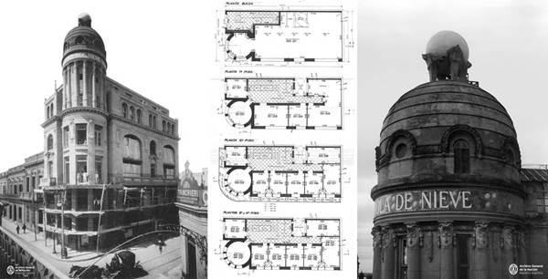 Figura 2. De izquierda a derecha: 2a. Construcción del Edificio La Bola de Nieve (1907), AGN_DDF/ Caja 3056, inv: 89253; 2b. Planos, Archivo Obras Particulares Municipalidad de Rosario, Carpeta 9816; 2c. Cúpula de "La Bola de Nieve”, AGN_DDF/ Caja 3056, inv: 89254.