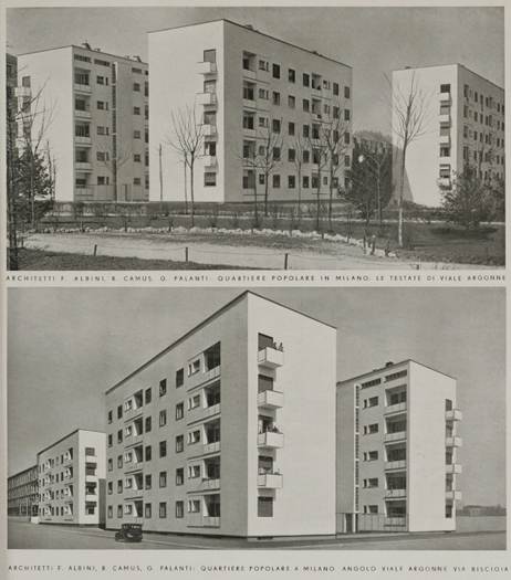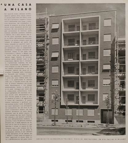 Antes da guerra, Palanti projetou um pequeno conjunto de edifícios. Boa parte deles não ultrapassava cinco a seis pavimentos e se destinava à habitação popular promovida pelo regime, realizados para o Istituto Fascista Autonomo delle Case Popolare, como foi o Conjunto Fabio Filzi. Projetado e construído entre 1934 e 1938 por ele, Albini e Camus, ficava em uma área de então expansão e periferia da cidade, como mostram as fotografias publicadas em Casabella, em 1939 (Albini, et al., 1939). (Figura 2).