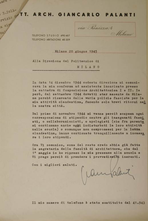 4 Io però, dal settembre 1944 dovetti star assente da Milano perché ricercato dalle varie polizie fasciste per la mia attività clandestina, facendo solo brevi ritorni nella nostra città”. Palanti, G. [Carta], 20 giu. 1945, Milano [para] Direzione del Politecnico di Milano, Milano. Archivio Storico di Ateneo. Archivi Storici e Attività Museali, Politecnico di Milano – ACL.